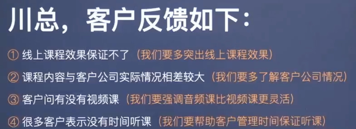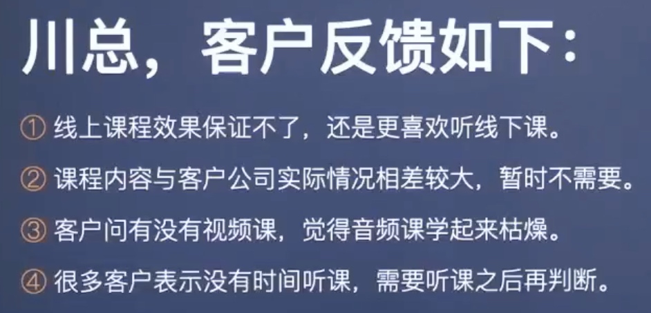 - 客户喜欢什么样的视频课?这是机会。音频课的机会,有没有跟客户说过?可以开车听,等等