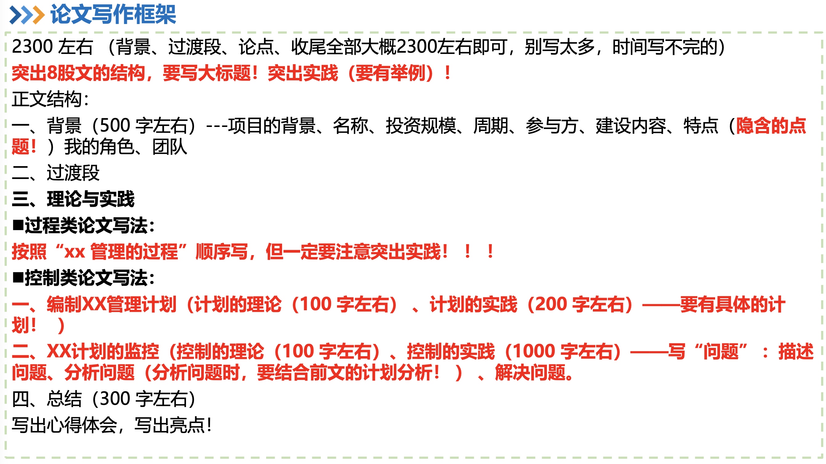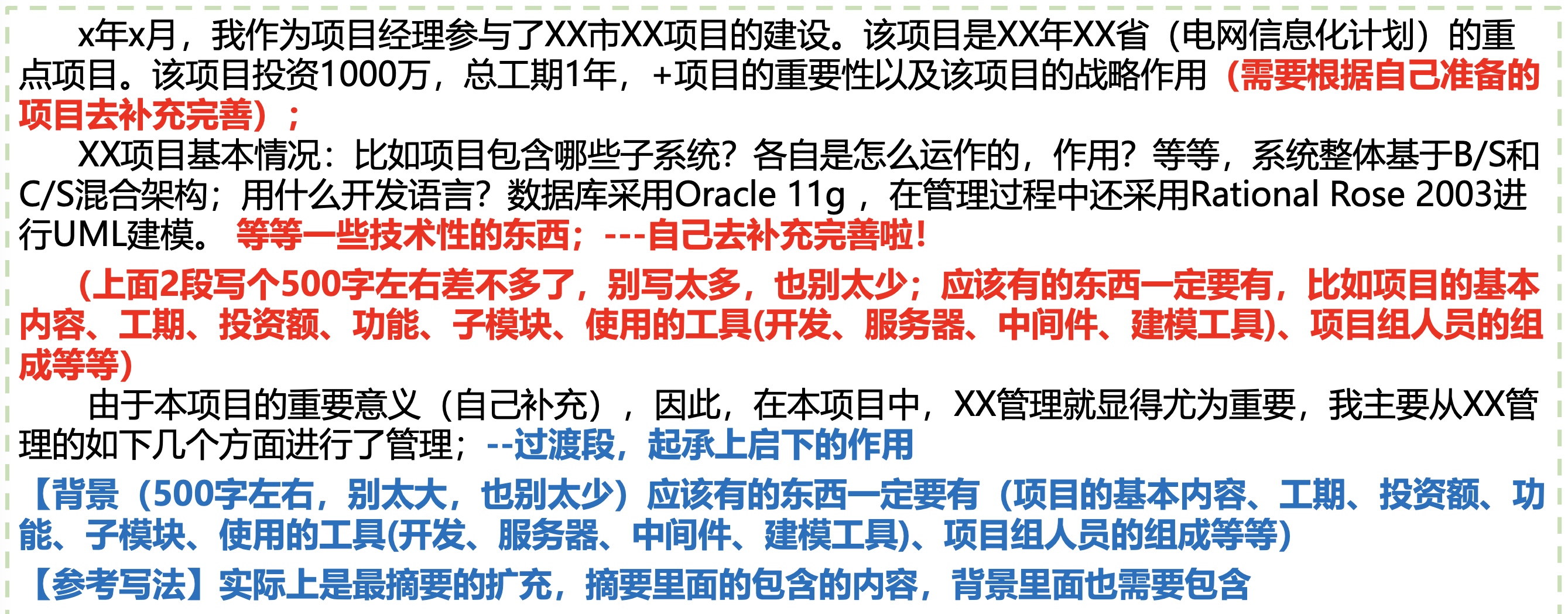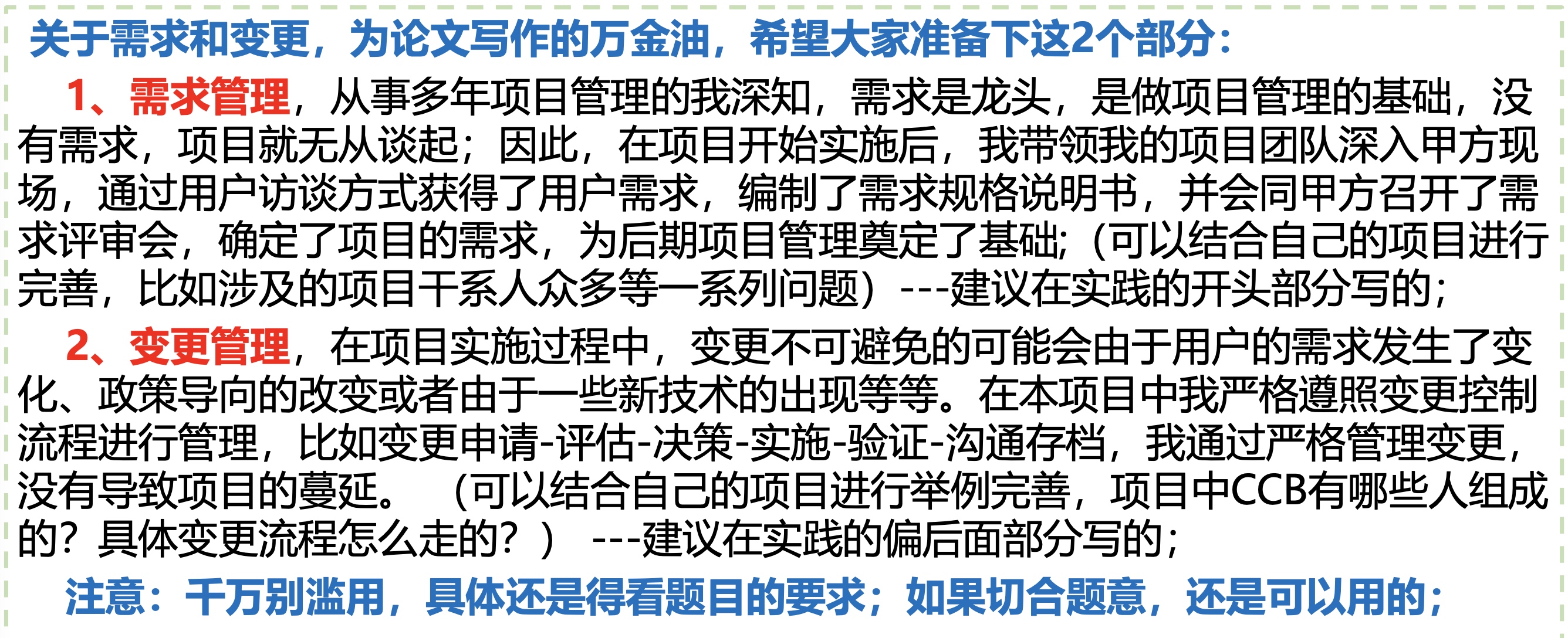 软考高项-02论文写作基本介绍 注意,不要撞车,要耳目一新。找一些少一点的,最新技术或者要求。 每个管理有哪几个过程、介绍? 每个子过程的输入、输出、工具和技术有哪些? 每个管理领域可能会出现什么问题,应该怎么 解决 每个管理和其余管理的联系是什么? 某一个管理的具体要求?比如让你写变更流程、范围说明书的内容、5层WBS、甘特图制定进度计划、招投标流程等等 Previous 软考高项-01 Next 更新oh-my-zsh FEATURED TAGS 测试 管理 江山老师 软考高项 杂谈 年终总结 建站 自我介绍 规划 解决问题 Go FRIENDS 插座学院 Sherry Wu Luke 的自留地 Ebn's Blog SmdCn's Blog JiyinYiyong David's Game DHong Say 尹峰以为 蕨根 郭姐