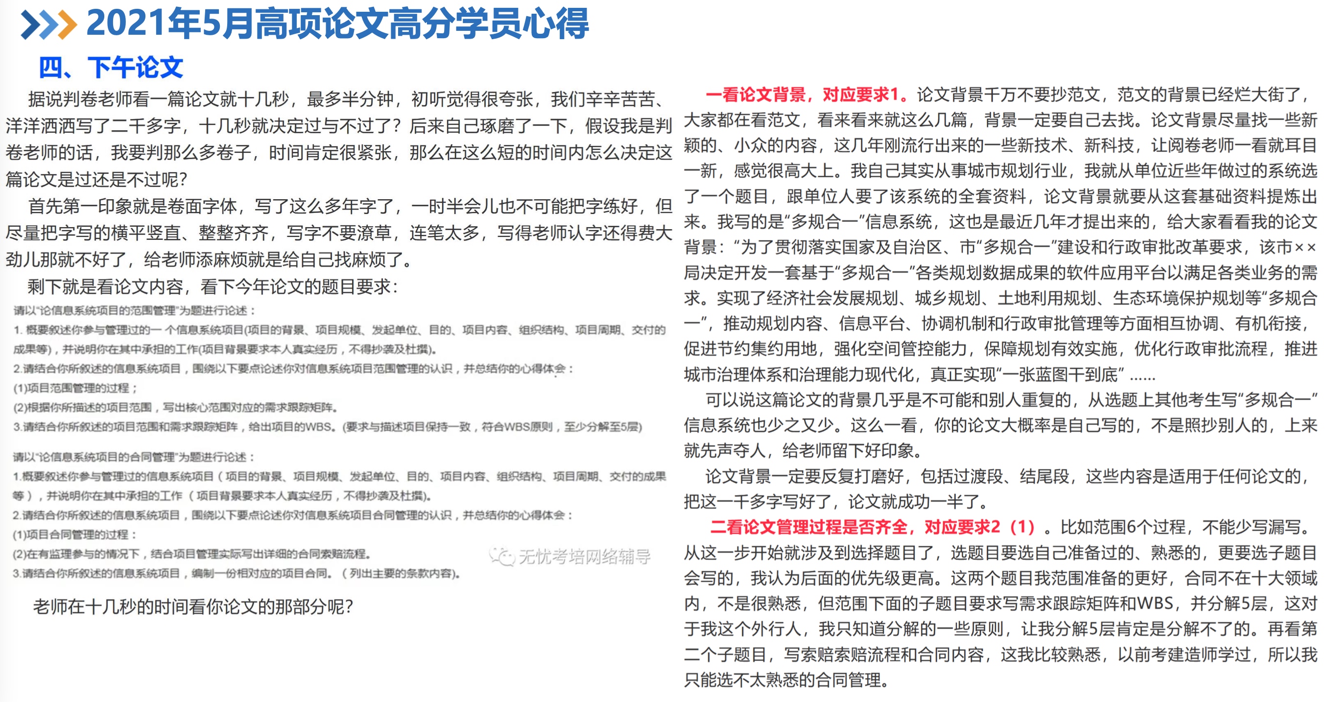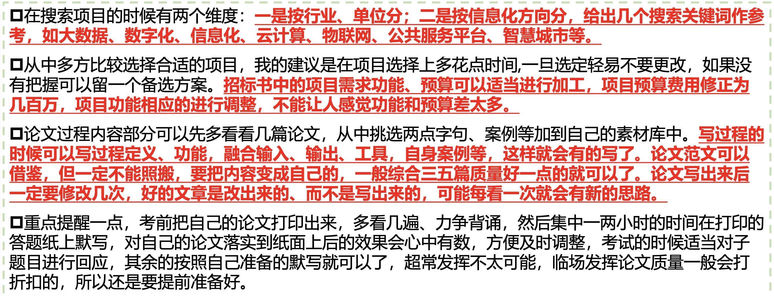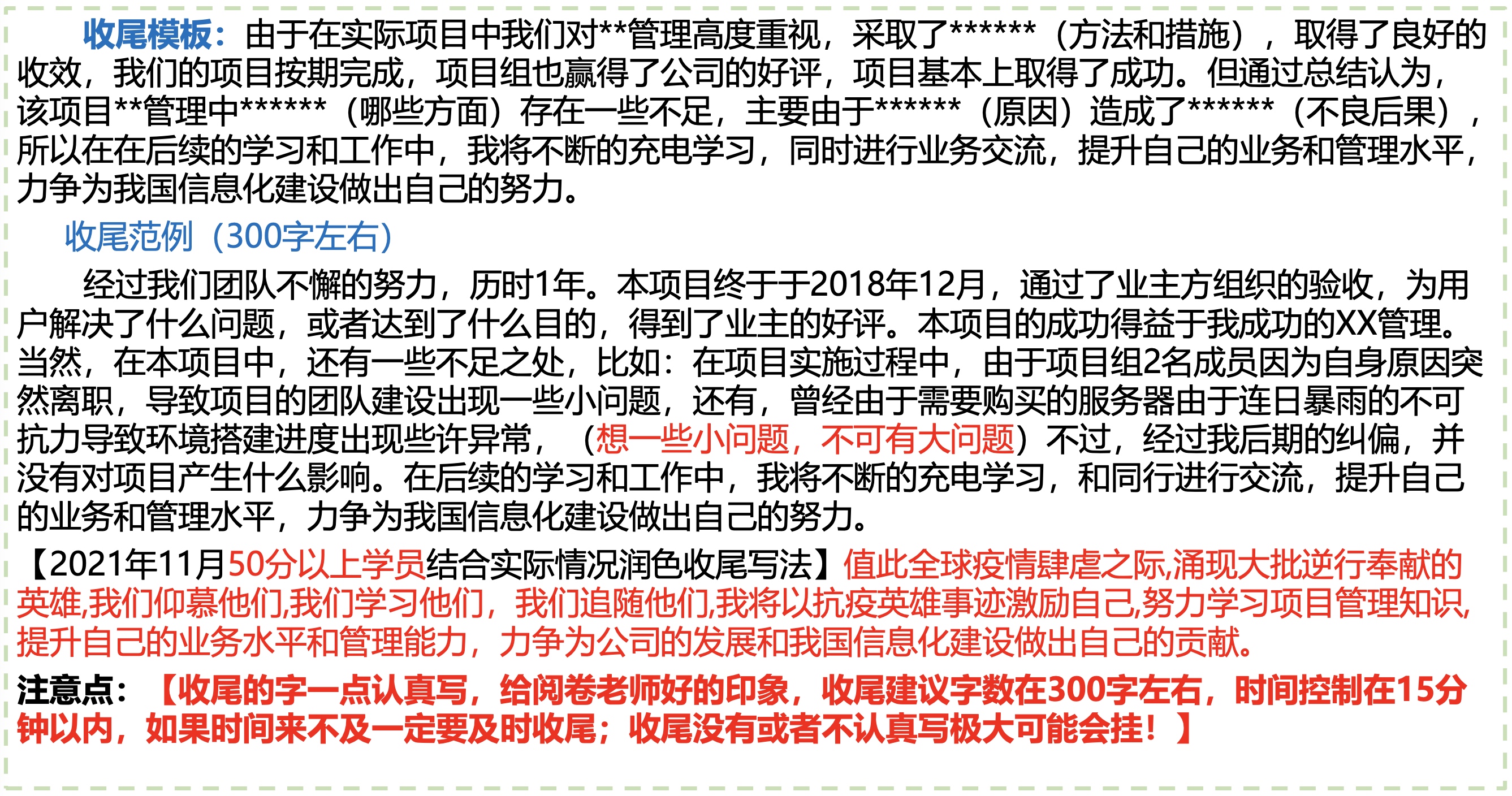 软考高项-02论文写作基本介绍 注意,不要撞车,要耳目一新。找一些少一点的,最新技术或者要求。 每个管理有哪几个过程、介绍? 每个子过程的输入、输出、工具和技术有哪些? 每个管理领域可能会出现什么问题,应该怎么 解决 每个管理和其余管理的联系是什么? 某一个管理的具体要求?比如让你写变更流程、范围说明书的内容、5层WBS、甘特图制定进度计划、招投标流程等等 Previous 软考高项-01 Next 更新oh-my-zsh FEATURED TAGS 测试 管理 江山老师 软考高项 杂谈 年终总结 建站 自我介绍 规划 解决问题 Go FRIENDS 插座学院 Sherry Wu Luke 的自留地 Ebn's Blog SmdCn's Blog JiyinYiyong David's Game DHong Say 尹峰以为 蕨根 郭姐